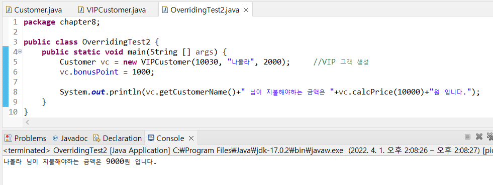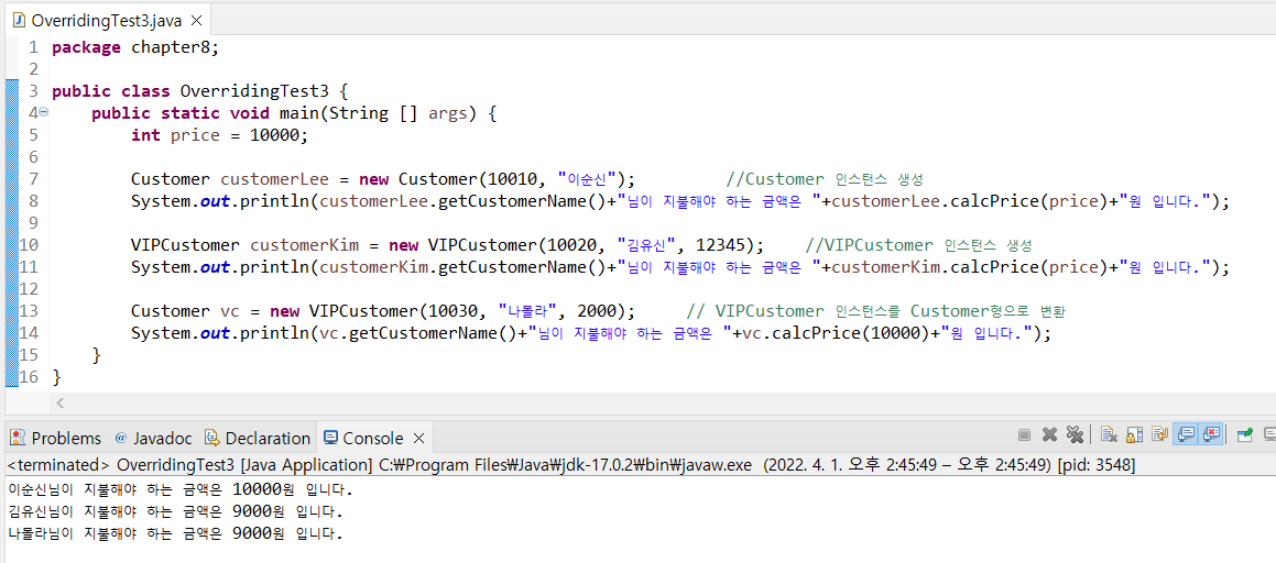 -> 마지막 13행에서 VIPCustomer로 생성하고 Customer형으로 변환한 vc는 원래 Customer형 메서드가 호출되는 것이 맞지만, 가상 메서드 방식에 의해 VIPCustomer 인스턴스의 메서드가 호출되어 할인 가격 9,000원이 출력된다.