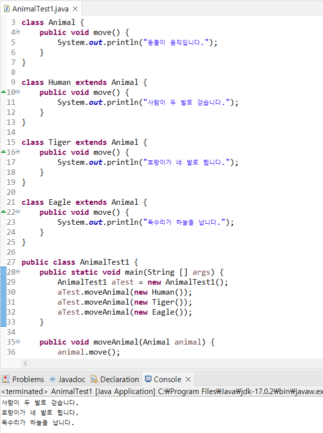 -> 테스트를 하기 위해 AnimalTest1 클래스에 moveAnimal() 메서드를 만들었다. 이 메서드는 어떤 인스턴스가 매개변수로 넘어와도 모두 Animal형으로 변환한다. 예를 들어 매개변수가 전달되는 부분에 Human 인스턴스가 전달되었다면 Animal형으로 변환되므로 animal.move() 메서드를 호출할 수 있다. 가상 메서드의 원리에 따라 animal.move() 메서드가 호출하는 메서드는 Animal의 move가 아닌 매개변수로 넘어온 실제 인스턴스의 메서드이다. animal.move() 코드는 변함이 없지만 어떤 매개변수가 넘어왔느냐에 따라 출력문이 달라지는데 이것이 바로 다형성이다.