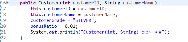 -> 기존 Customer 클래스 수정한 내용. initCustomer() 메서드는 클래스의 멤버 변수를 초기화 하는데, Customer 클래스를 생성하는 두 생성자에서 공통으로 사용하는 코드이므로 메서드로 분리하여 호출함