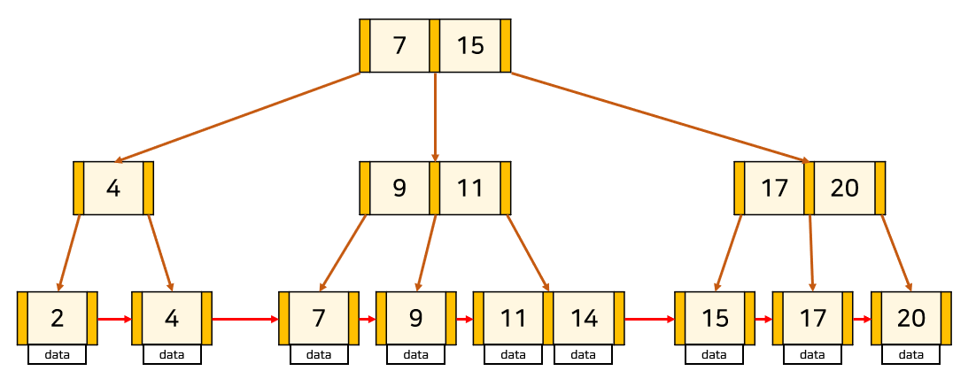 반면, B- Tree는 최상의 경우 특정 Key를 root node에서 찾을 수 있지만, B+Tree의 경우 반드시 leaf node까지 가야함.
