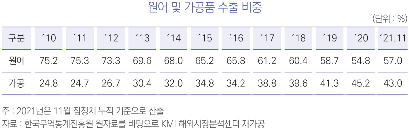 국내 수산물은 원어 대비 가공품의 수출 비중이 늘어나고 있는 추세이며, 제조업 기반의 인프라 및 접근성 높은 해양자원을 바탕으로 국제 수산물 시장에서의 경쟁력을 높여나가고 있음.