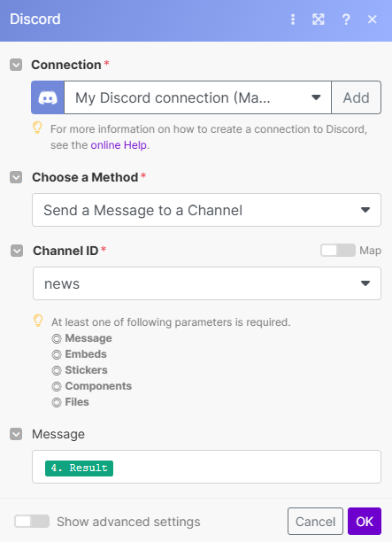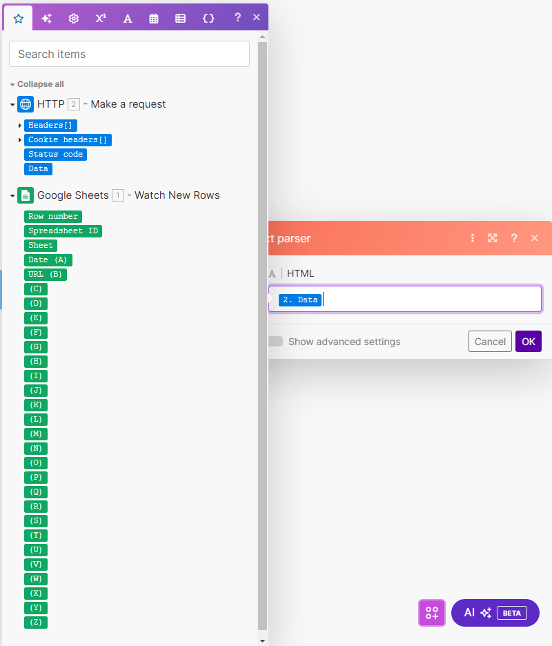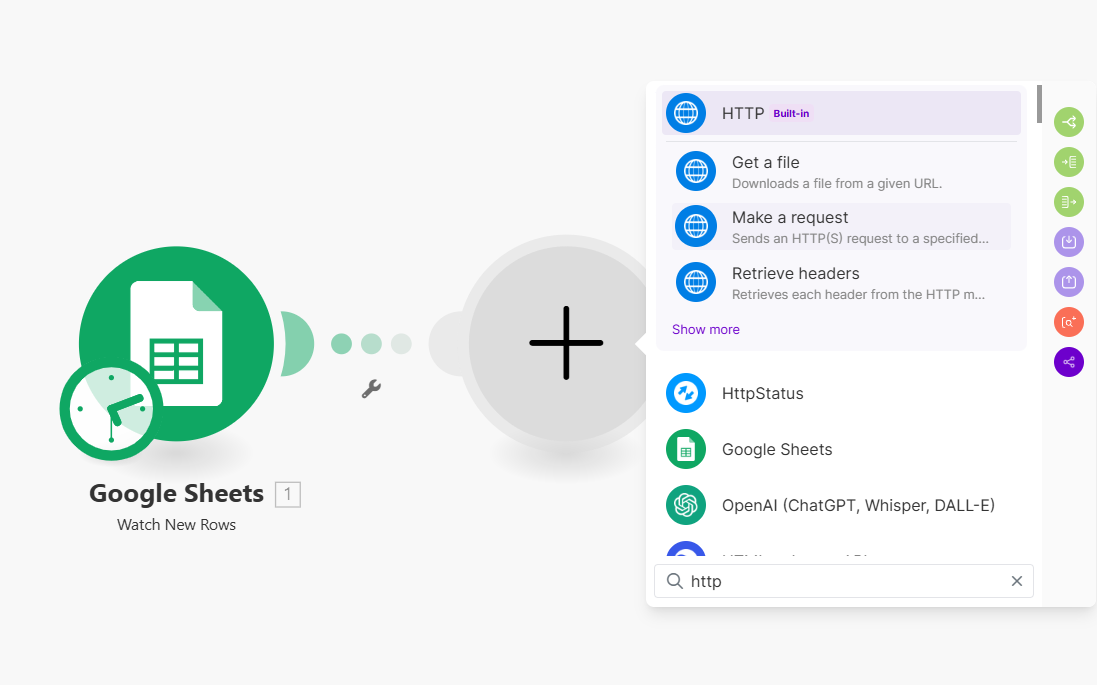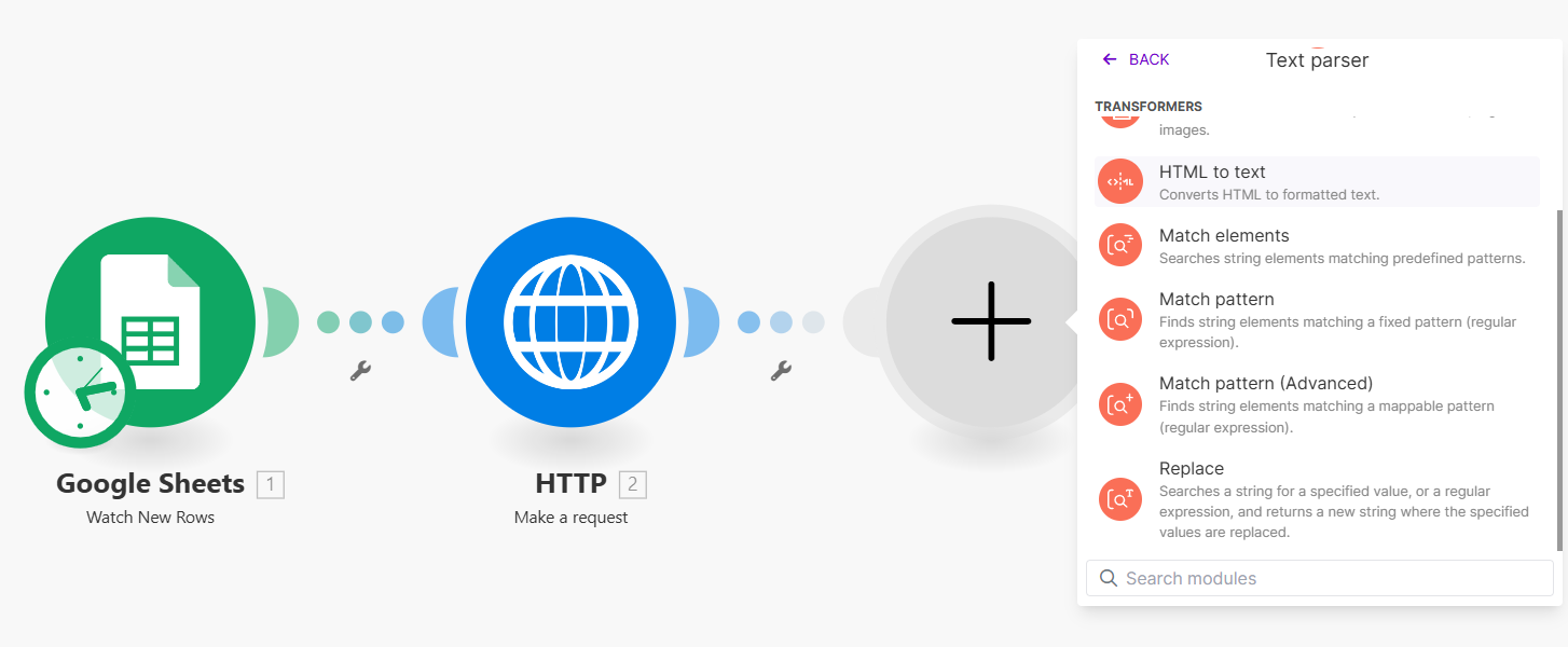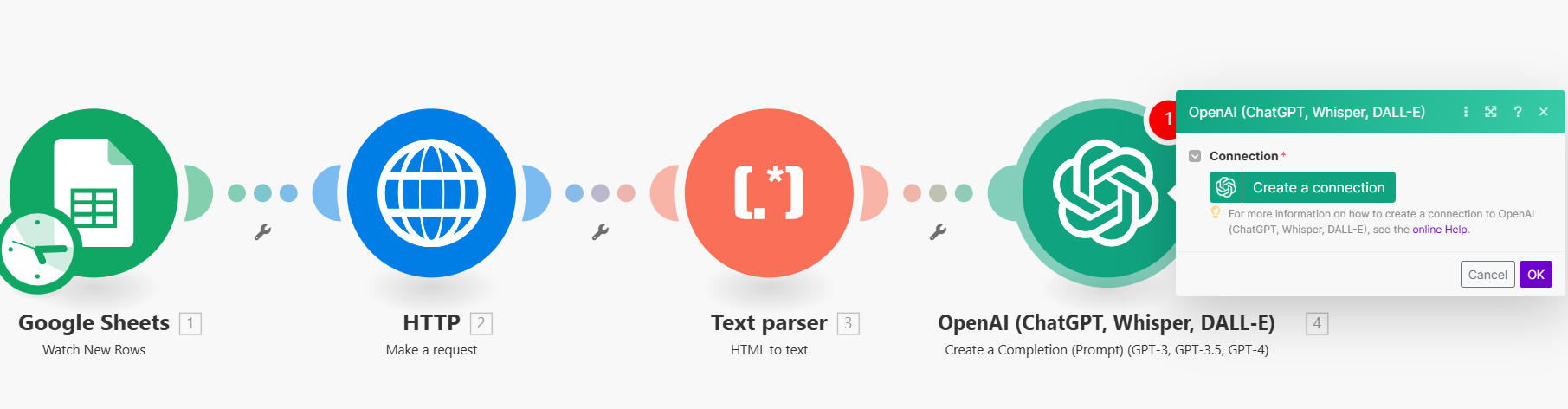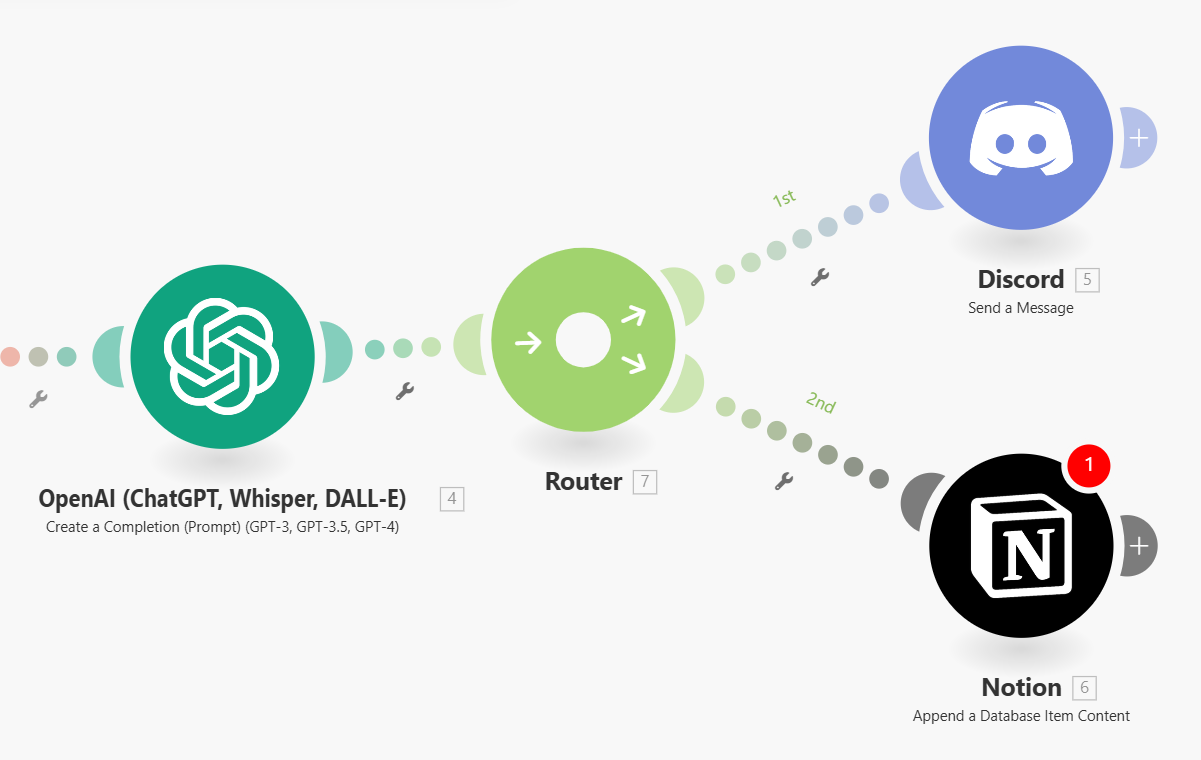 google sheets -> HTTP -> Text parser -> chatGPT -> Discord -> Notion