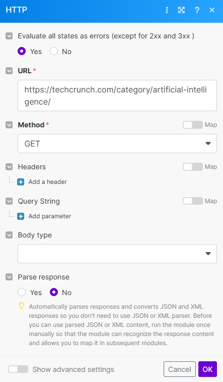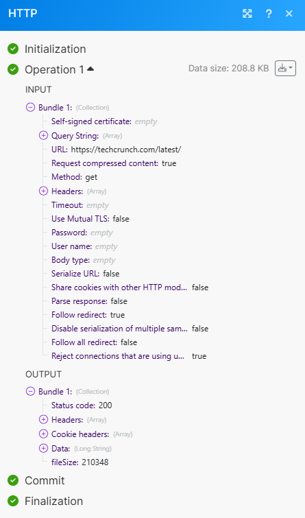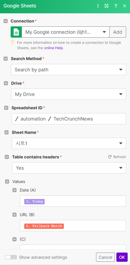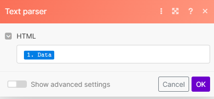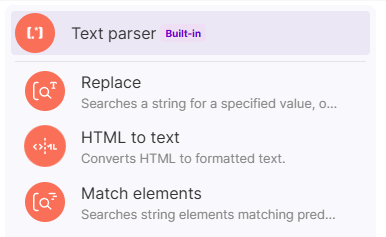 HTTP -> Text parser -> Tools -> Text parser -> google sheets