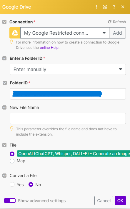 저장할 드라이브 경로의 URL 뒷부분이 Folder ID임.