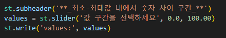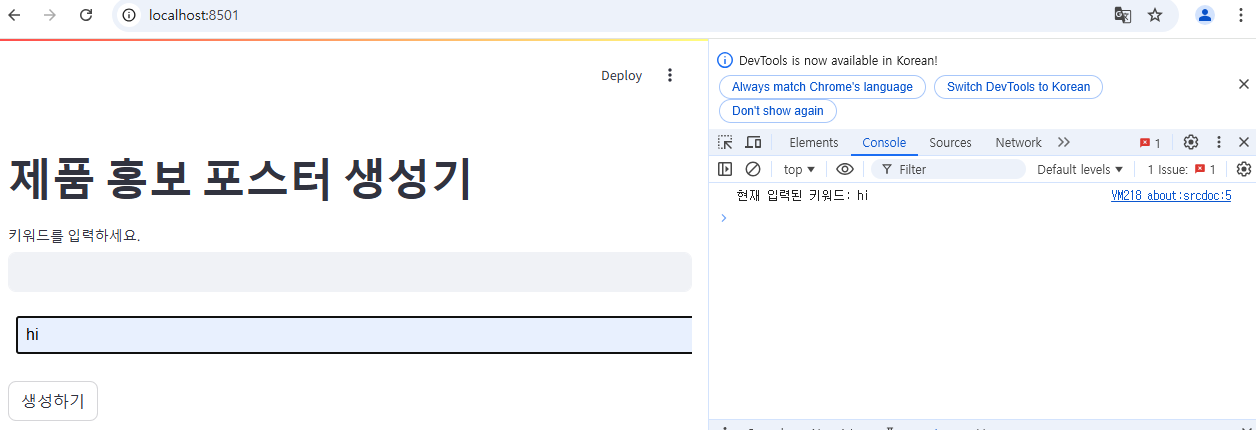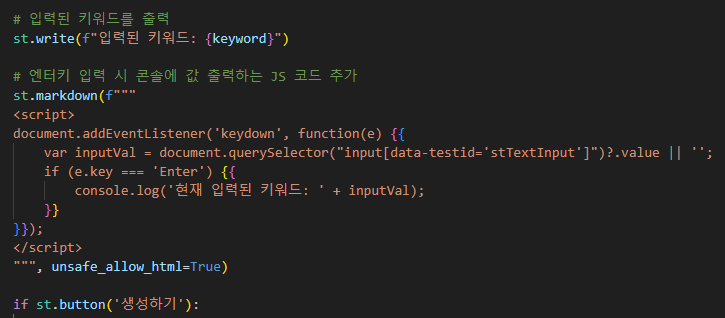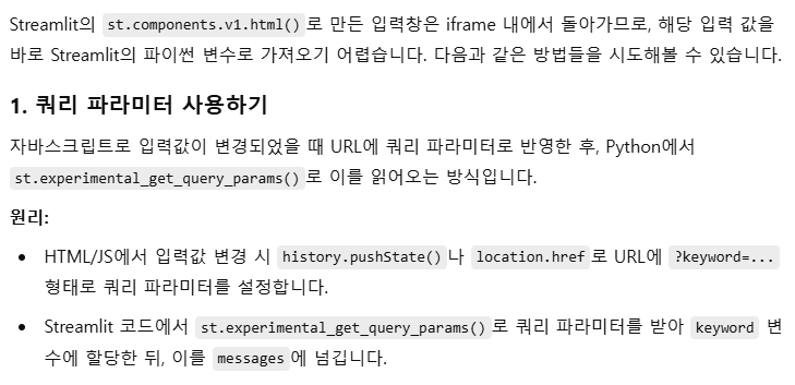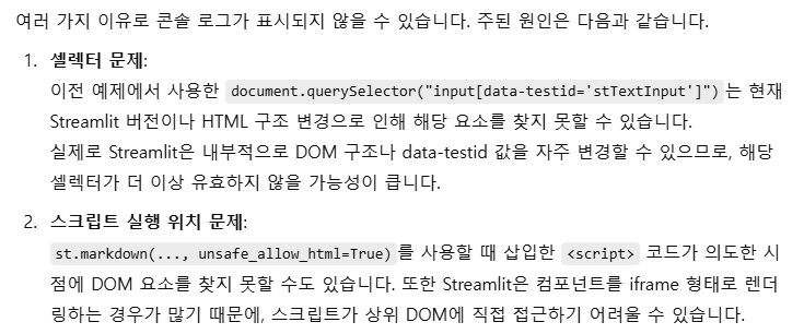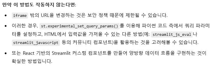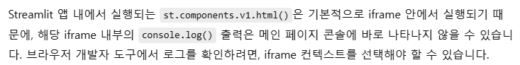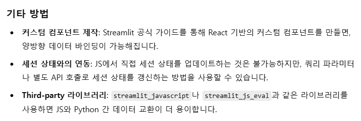 추후에 사용자 입력값을 브라우저 콘솔에서 확인하는 과정 포함하여 streamlit을 활용한 양방향 데이터 흐름을 더 알아보면 될 것 같다.