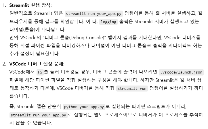 stremlit 디버그 로그가 파이썬 디버그 콘솔에 나오지 않는 이유 참고