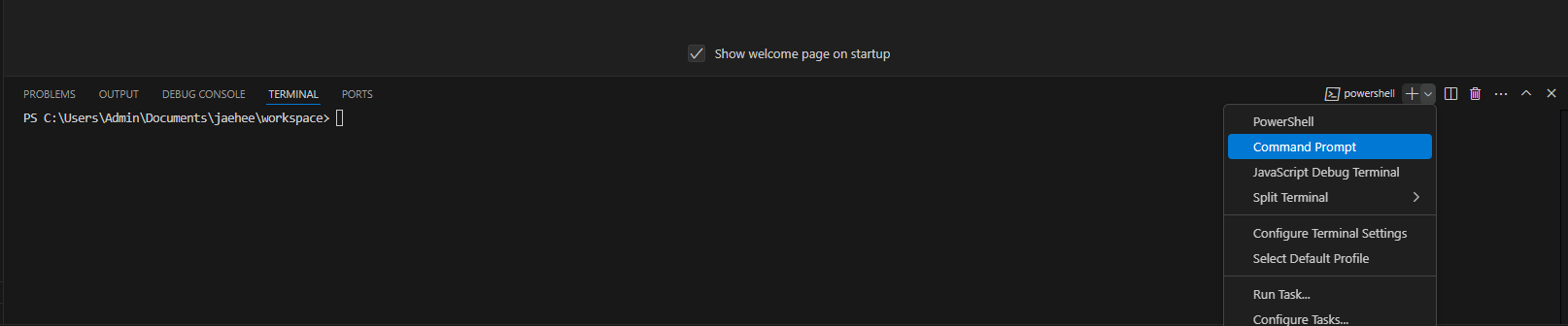 터미널을 열어서 power shell이 아닌 command prompt로 설정