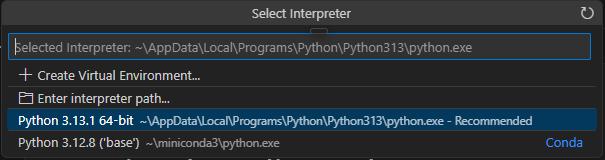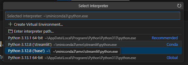 miniconda 가상환경을 설치하면 select interpreter의 목록에서 확인 가능하다.