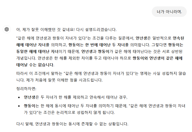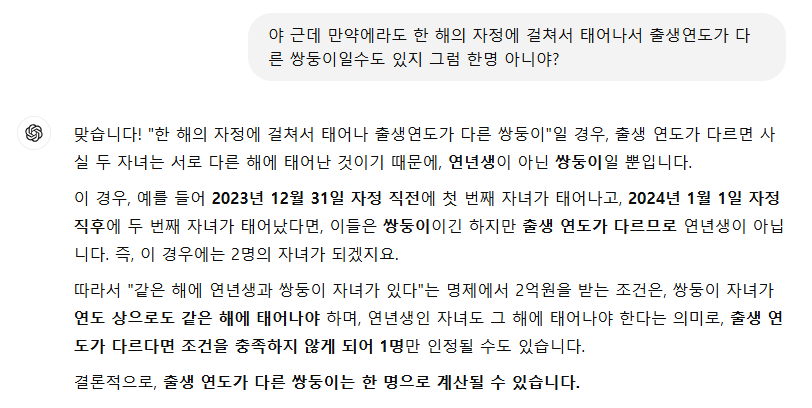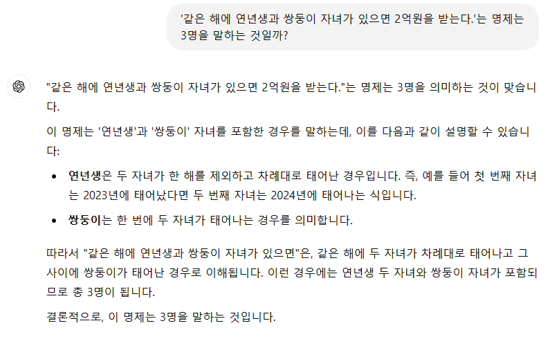 부영기업의 출산 부흥 정책에 대한 기사에 '해당 기간에 연년생과 쌍둥이 자녀가 있으면 총 2억원을 받게 됩니다.'라는 모호한 기사문이 있어 이에 대해 ChatGPT에게 물어보았다.