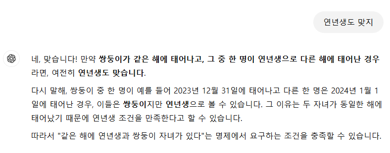 마지막 답변에 대한 나의 질문 : 쌍둥이는 자정에 걸쳐서 태어나면 '한해에 태어난 쌍둥이'라는 개념에 포함시키면서, 연년생은 왜 '한해에 태어난 연년생' 개념에 포함 안 시키는지...?