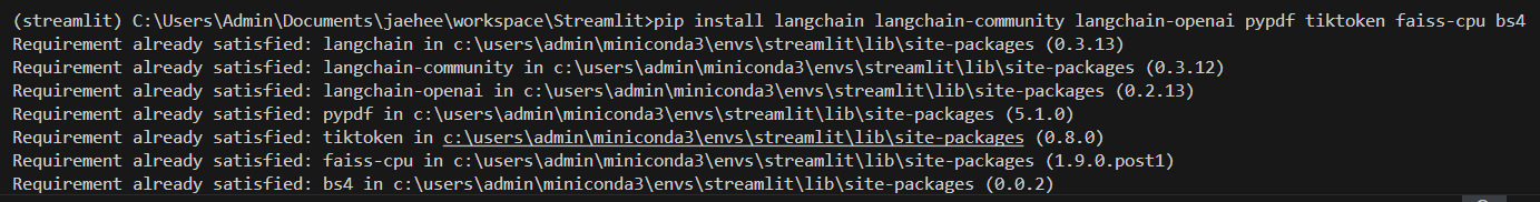 가상환경 터미널에 LangChain, LangChain-community, LangChain-openai, pypdf, tiktoken, FAISS, BS4 설치