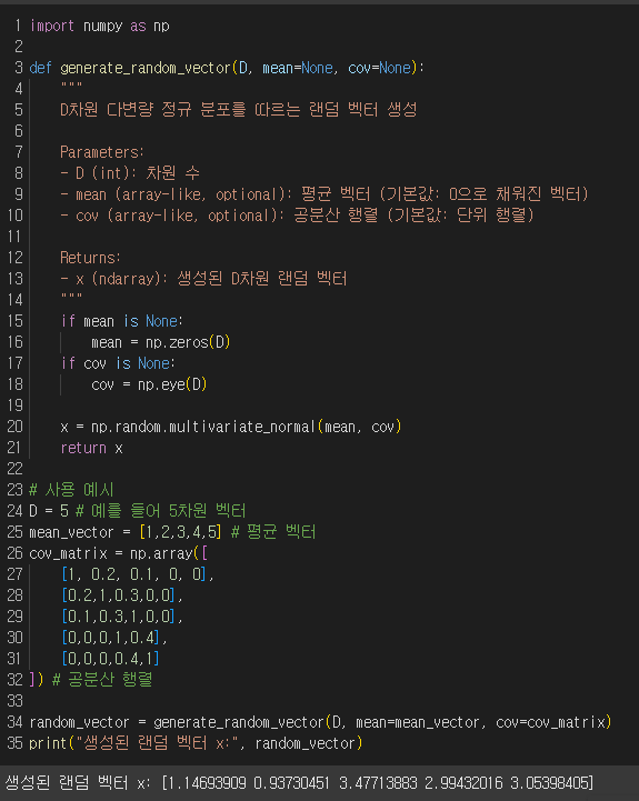 예시 : NumPy 라이브러리를 사용하여 D차원 실수 공간에서 다변량 정규 분포(Multivariate Normal Distribution)를 따르는 랜덤 벡터를 생성
