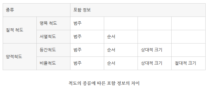 명목-서열-등간-비율 (데이터의 양이 커짐)