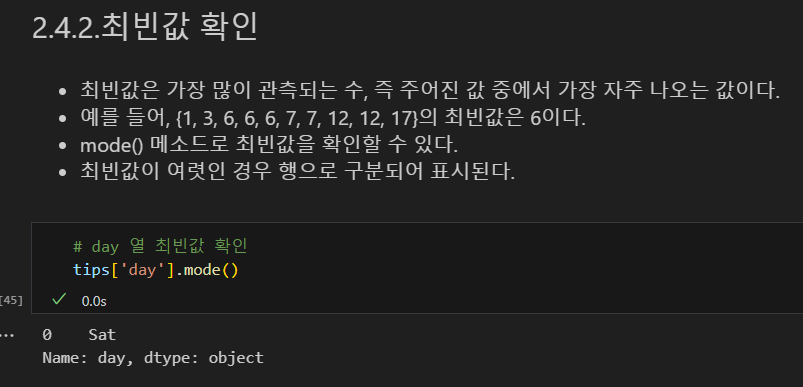 최빈값 (가장 자주 나오는 값) : mode() 메소드로 확인