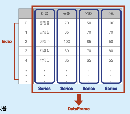 각 열은 Series 객체로 구성되며, 다양한 데이터 타입을 가질 수 있음