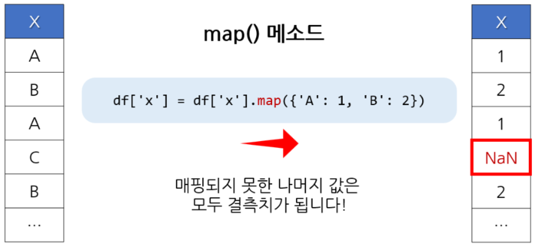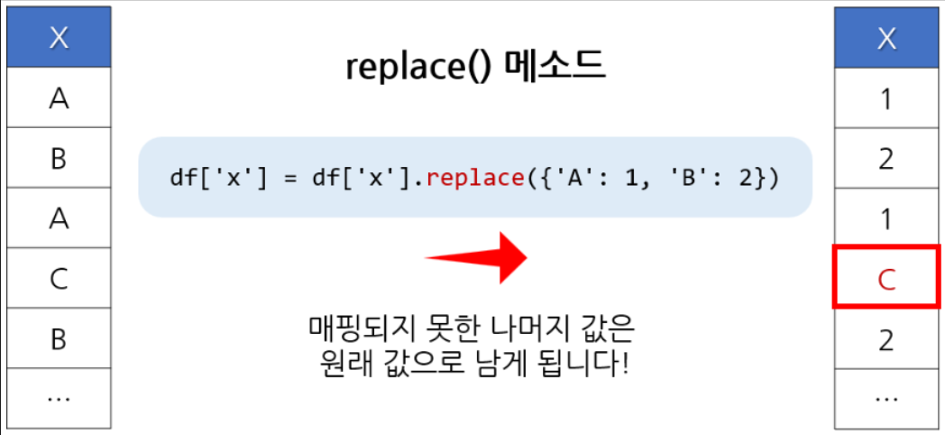 replace 메소드는 맵핑이 안 되면 데이터를 그대로 둠. map은 맵핑이 안 되면 결측치가 됨.