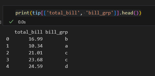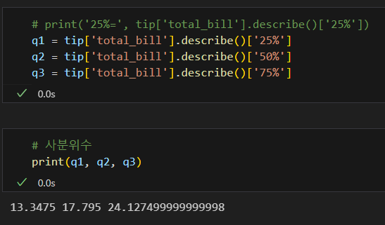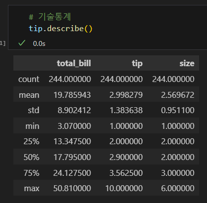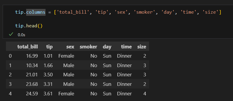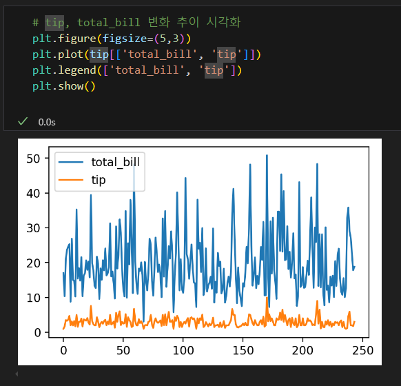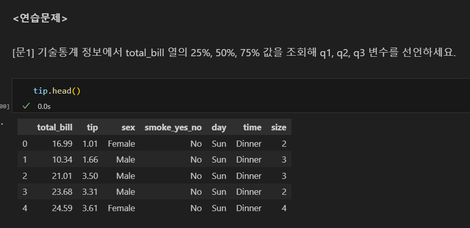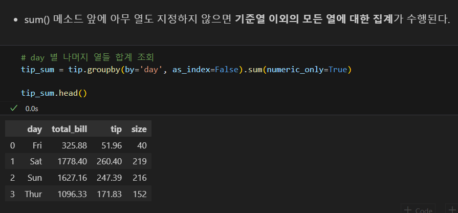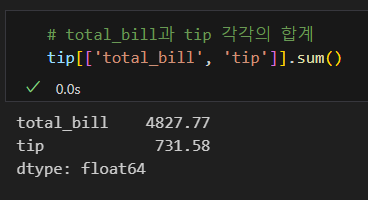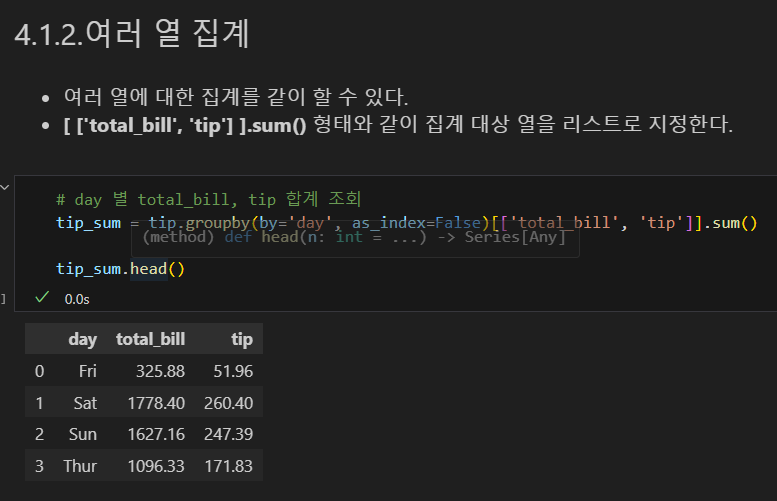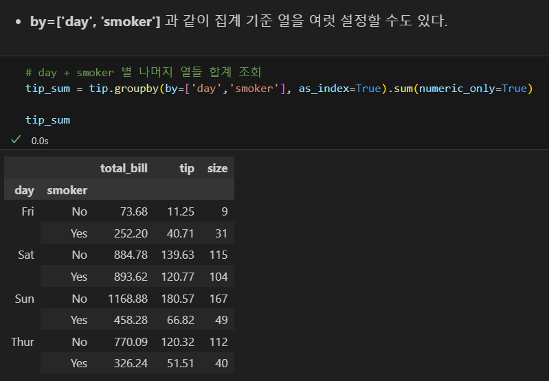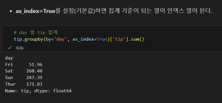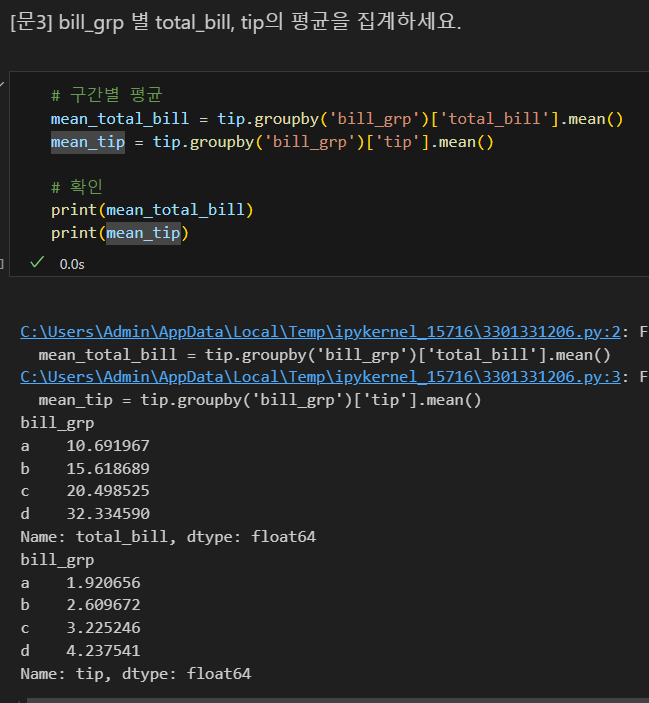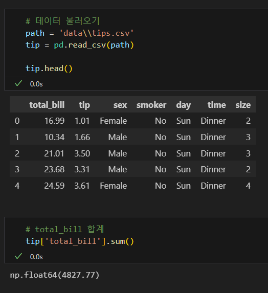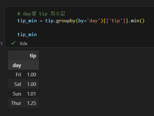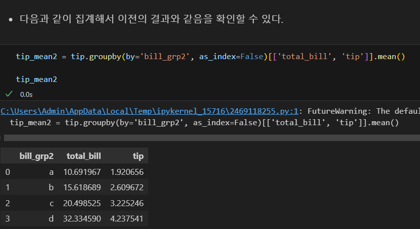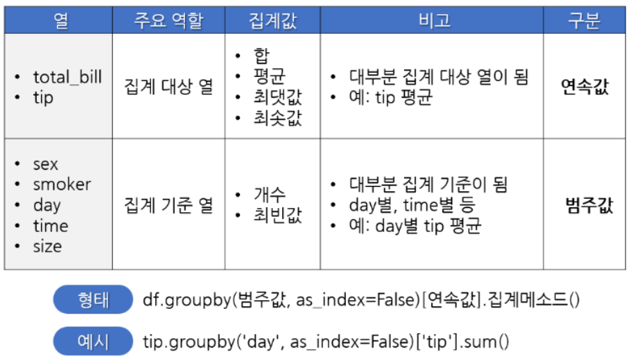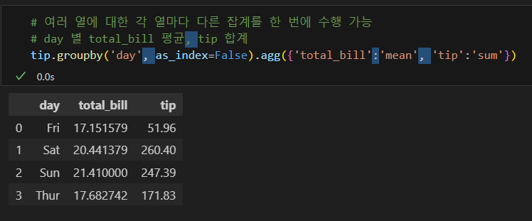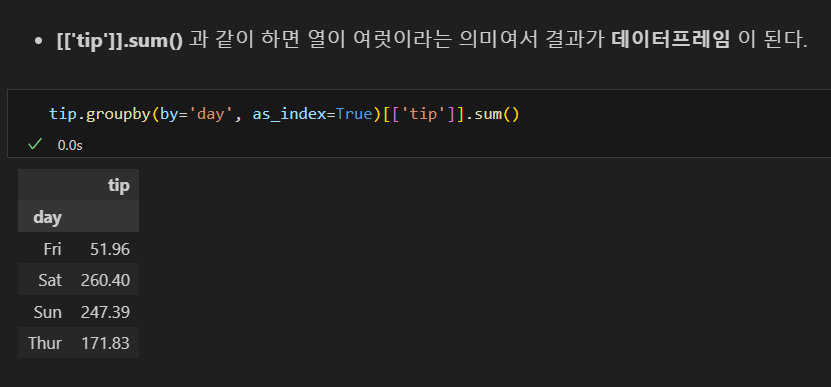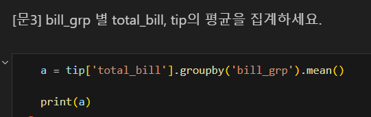 나는 tip['total_bill'] 코드란: 불러올 값을 그 열로 한정한다는 의미가 아니라, 그 열이기도 하고, groupby의 조건과 겹치기도 하는 값을 구할 수 있을 줄 알고 그렇게 썼으나, 파이썬에게는 해당되지 않는다. 즉, 파이썬에서는 객체화하지 않고 동시에 명령할 수 없다.
