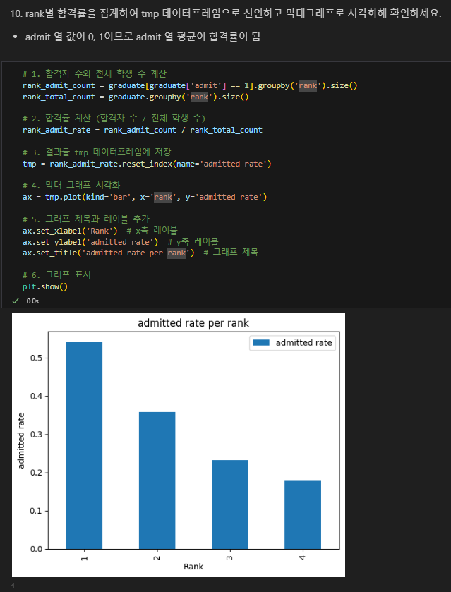 전체 학생수 대비 합격 학생수를 구한 뒤 합격율을 구하여 이를 rank별로 표시.