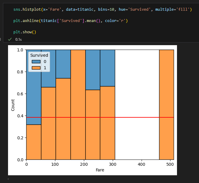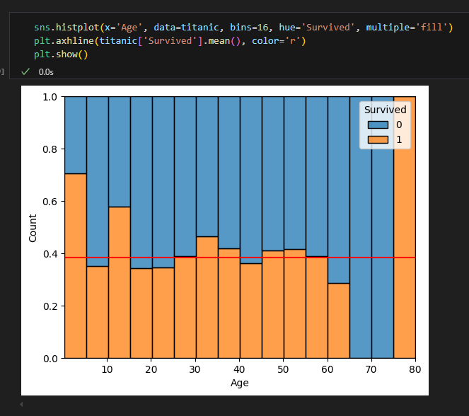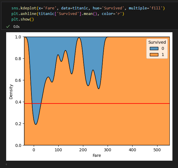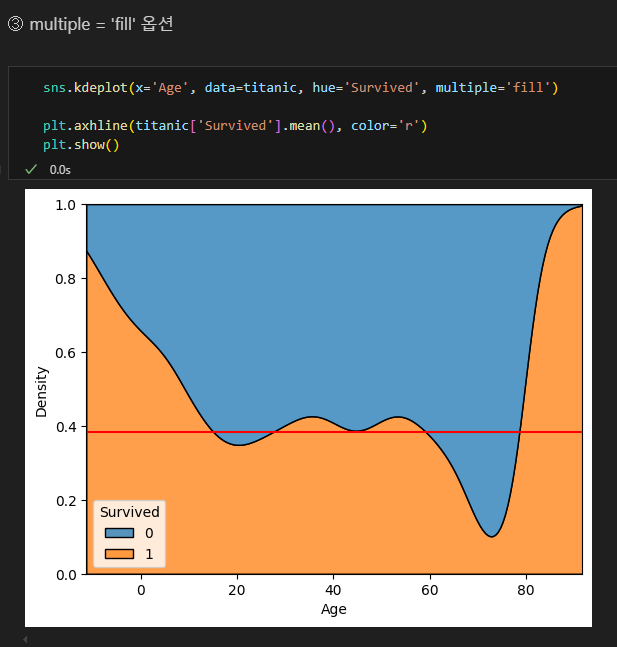 주황색 영역(1)은 생존자, 파란색 영역(0)은 사망자 비율