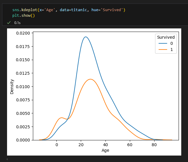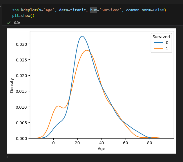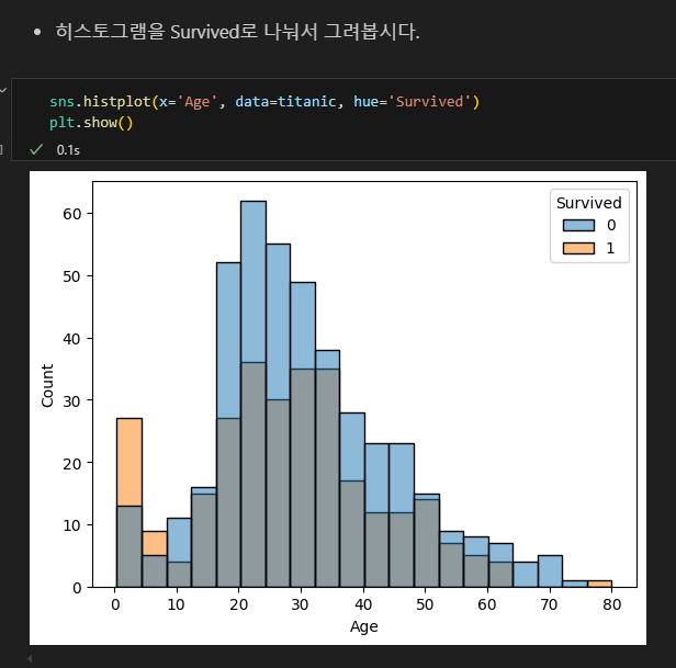 파란선(0)은 사망자, 주황선(1)은 생존자의 분포