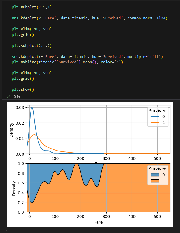 이 두 차트는 타이타닉 승객의 요금(Fare)과 생존 여부(Survived)의 관계를 보여주는 분포도