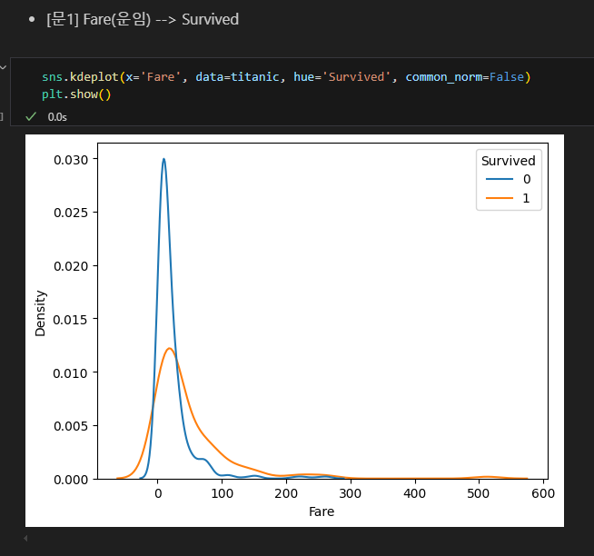 낮은 요금대(0-100)에서 가장 높은 밀도를 보이며, 특히 사망자(0)의 밀도가 더 높음