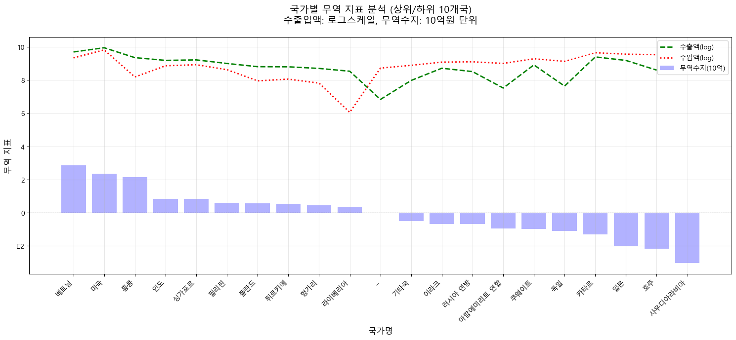 plt.title('국가별 무역 지표 분석 (상위/하위 10개국)\n수출입액: 로그스케일, 무역수지: 10억원 단위',