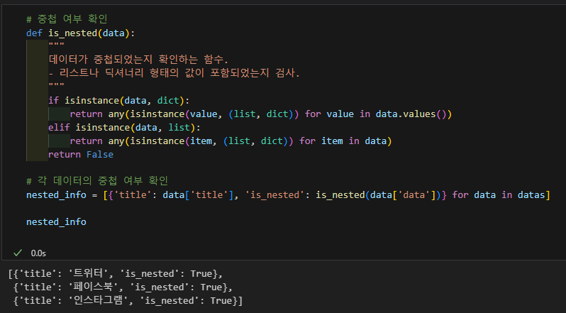 데이터 중첩(Nested Data)이란, 데이터가 딕셔너리(Dictionary) 또는 리스트(List) 형태로 계층 구조를 이루고 있는 상태를 말함. 즉, 데이터가 단순한 1차원 배열이 아니라, 내부에 또 다른 리스트나 딕셔너리를 포함하고 있는 경우를 의미함.