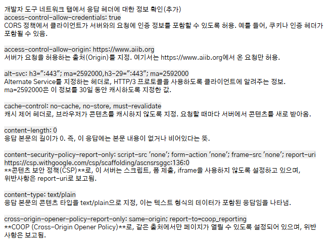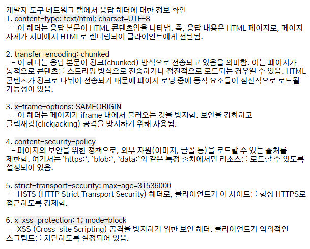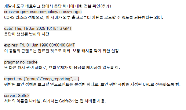 3. 개발자 도구 네트워크 탭에서 응답 헤더에 대한 정보 확인.