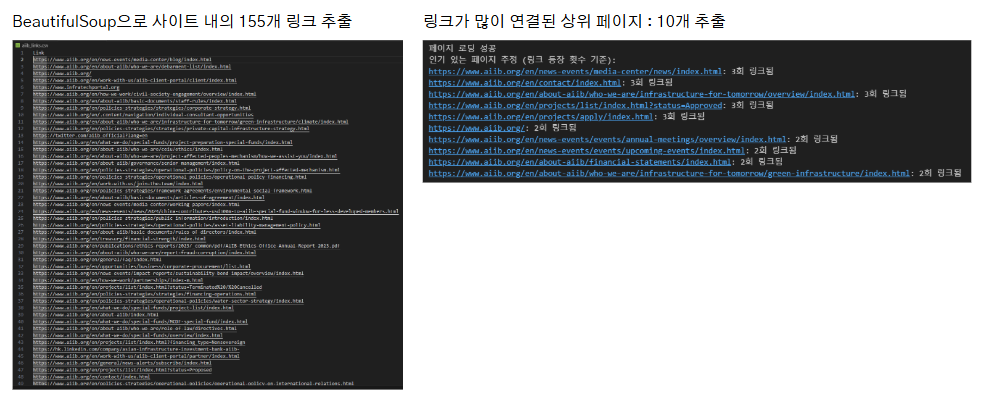 2. 활성도 높은 페이지 파악 : bot 활성도가 높은 페이지를 찾기 위해 ubuntu 환경에서 GoAccess를 설치하여 로그분석을 수행하고자 했으나 시간 제약으로 사이트 내의 링크 수집 후 인기있는 페이지를 간접 추정. AIIB의 재무 보고서 페이지와 프로젝트 리스트 페이지 두 개 페이지를 분석하기로 결정.