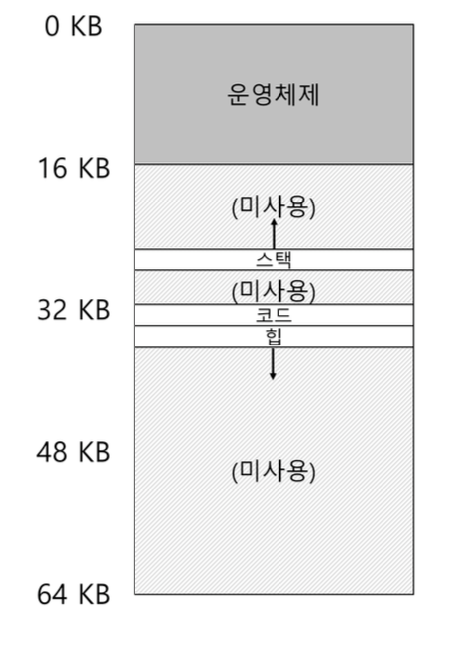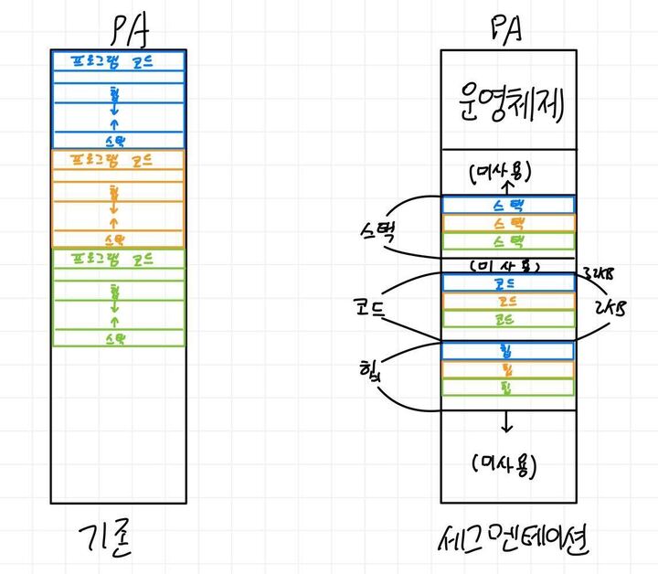 앞에서는 프로세스 주소 공간 전체를 메모리에 탑재하는 것을 가정했다. 하지만 이렇게 되면 단편화가 일어나 메모리 낭비가 심하다. 이를 해결하기 위한 아이디어가 세그멘테이션이다. 아이디어는 MMU에 하나의 베이스, 바운드 값이 존재하는 것이 아니라 세그멘트마다 베이스와 바운드 값이 존재한다. 쉽게 말해 코드/스택/힙 각 세그멘트에 대해 베이스와 바운드 값이 존재해 하나의 가상 주소 공간이 물리 주소 공간 상에서 연속적으로 붙어있는 게 아니라 세그멘트 단위로 흩어지게 만드는 것이다. 이렇게 하면 사용되지 않는 가상 주소 공간이 물리 메모리를 차지하는 것을 방지할 수 있다.