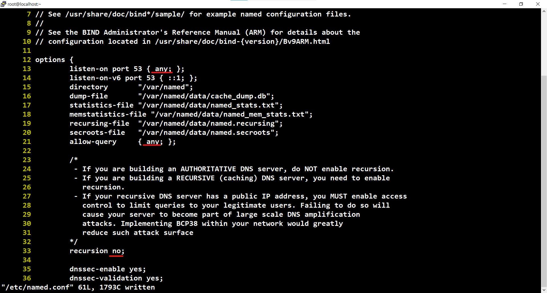 - recursion no : 도메인 이름들과 전혀 관계 없는 것 요청하는 DNS 이름 공격을 막기 위해서 no로 변경
