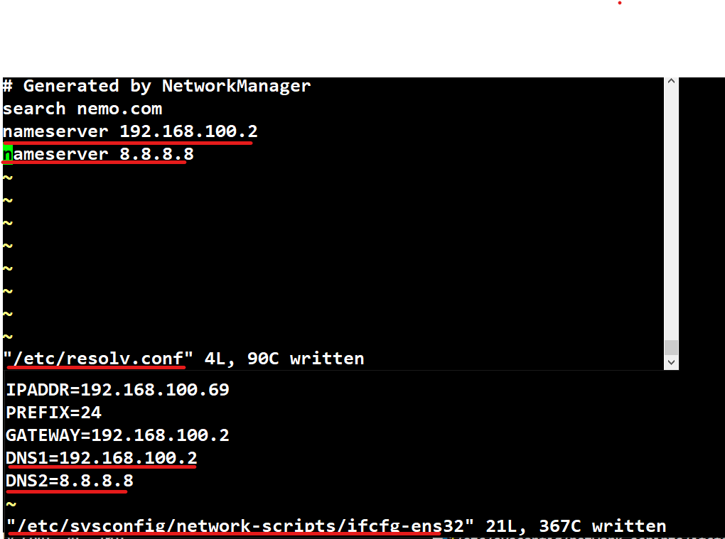 # vi /etc/sysconfig/network-scripts/ifcfg-ens32 # vi /etc/resolve.conf /etc/sysconfig/network-scripts/ifcfg-ens32를 작업하면 /etc/resolve.conf가 자동으로 설정된다.