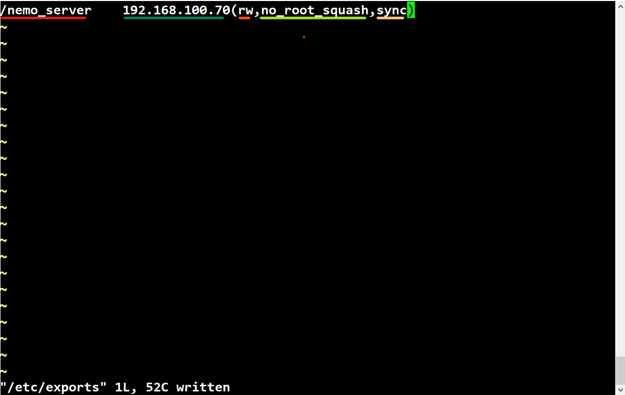 # exportfs -a : /etc/exportfs 설정 읽어서 적용 # systemctl restart nfs : 데몬 재실행 # exportfs -v : 적용값 확인