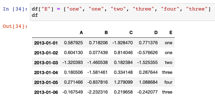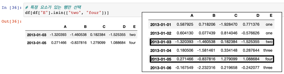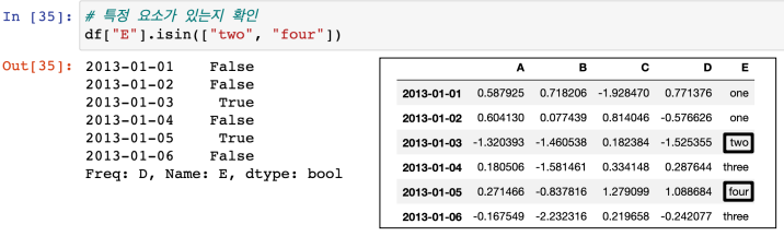 4) isin : E컬럼에 two나 four가 있느냐를 bool 타입으로 표시