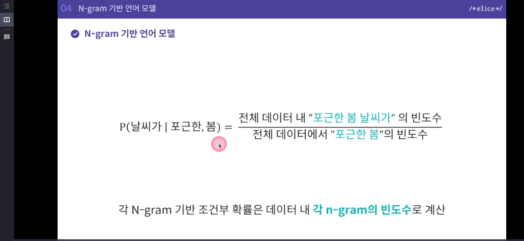 N-gram 기반 모델은 이러한 단어의 발생 확률을 계산할 때 이전의 단어를 전부 기억하는 것이 아니라 N개의 근접 단어의 발생 확률을 계산하는 방식이다. 다시 말하자면 데이터 내 각 N-gram의 빈도수로 계산하는 것이다.