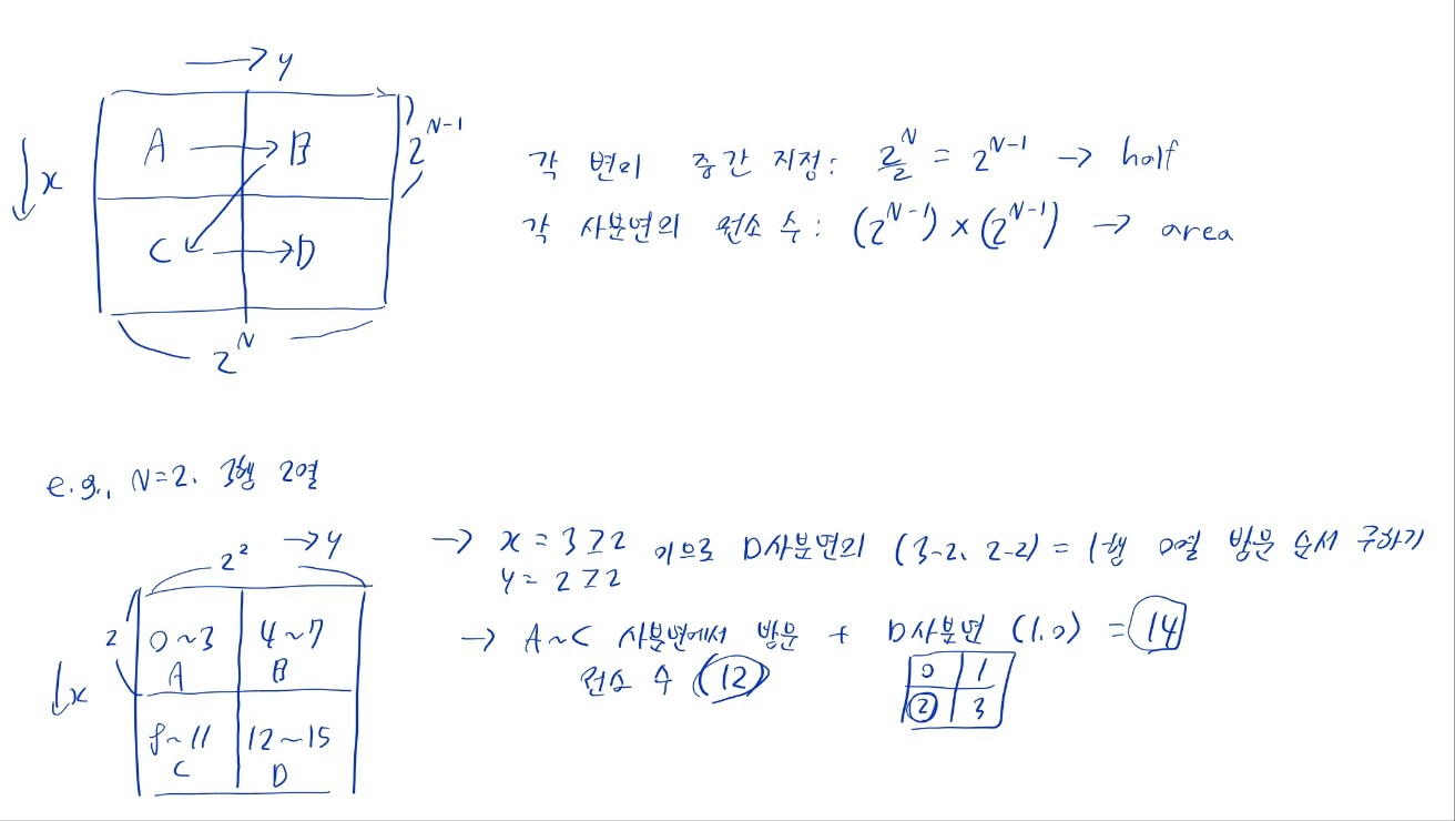 # 변의 길이가 2^N인 배열에서, x행 y열을 몇 번째로 방문?