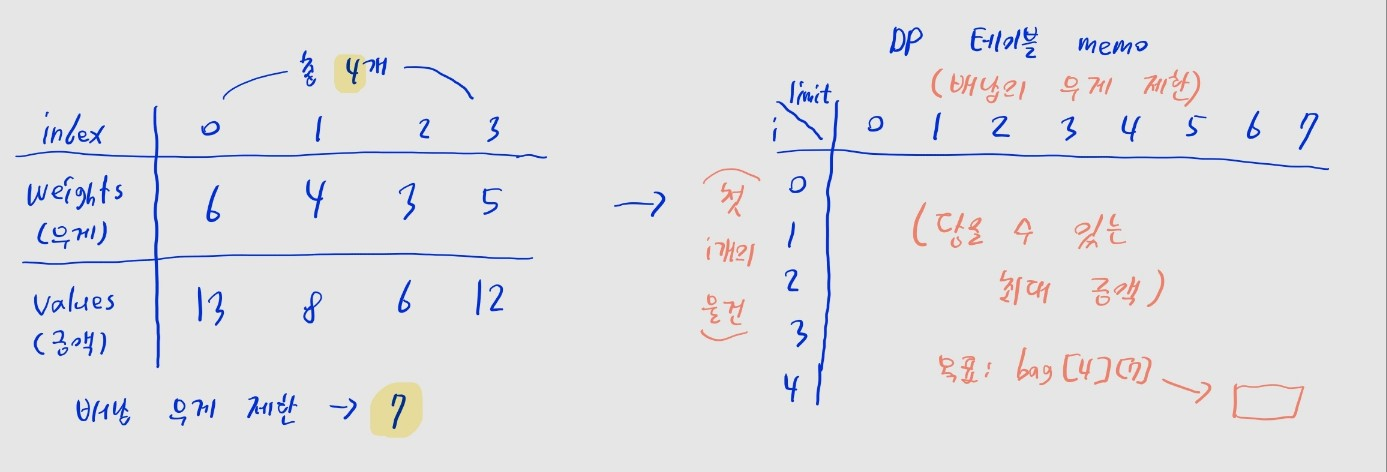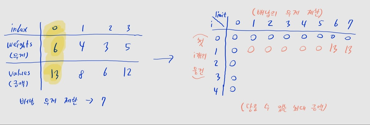 • 편의상 앞선 예제를 풀어보면서 진행하겠습니다. 한 물건씩 확인하면서 테이블을 채워 나갑시다.
