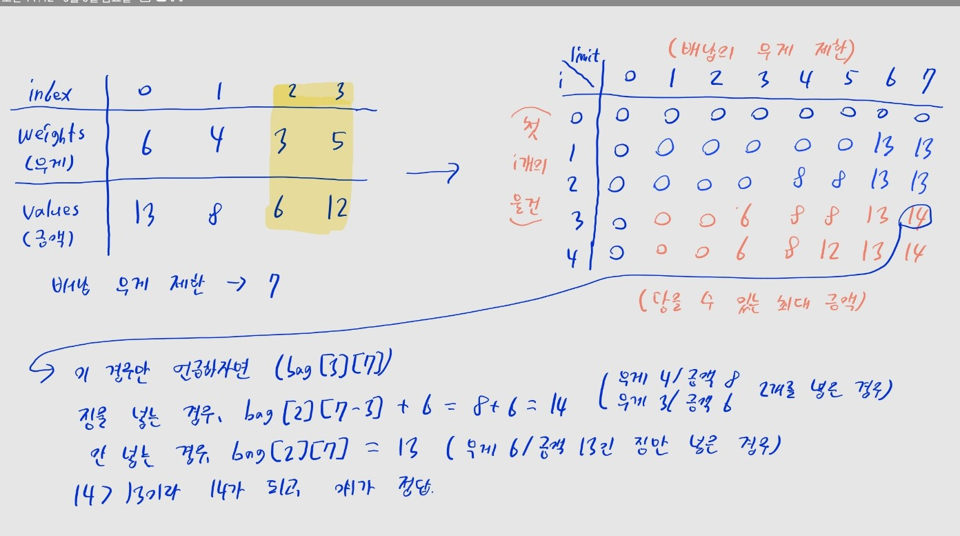 • bag[i][j]에는 무게 제한이 j인 배낭에 첫 i개의 물건을 담거나 담지 않을 수 있을 때, 가능한 최대 금액을 저장합니다.