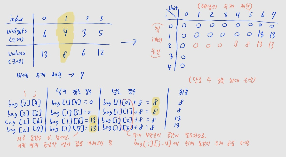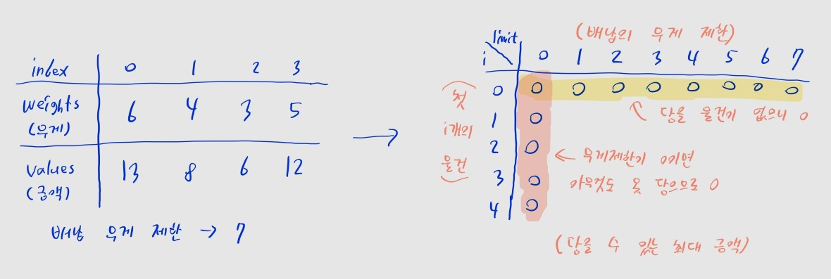 • j열은 배낭의 무게 제한이 j일 때를 뜻한다고 했었죠?