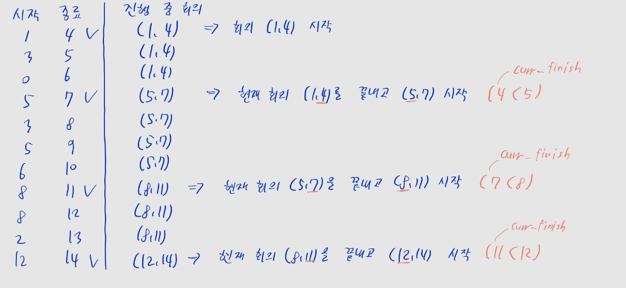 curr_finish = times[0][1] # 현재 회의가 끝나는 시간