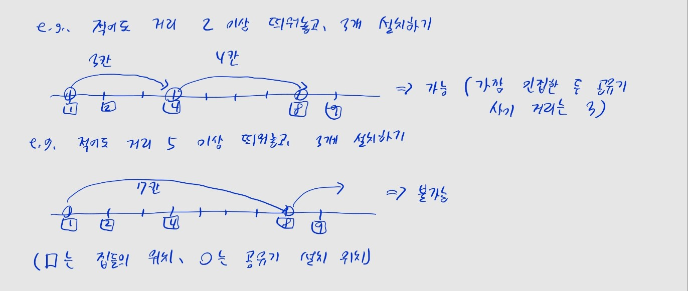 can_build 함수는 두 공유기 사이의 거리가 최소 n 이상이 되도록 하며, C개의 공유기를 설치할 수 있는지 반환합니다.n 이상인 집에만 설치합니다.min_dist 변수로 갱신합니다.houses.sort())C개를 모두 설치할 수 있으면, min_dist 값을 반환합니다.C개를 모두 설치하지 못한 경우, False를 반환합니다.for문으로 각 집을 1번씩 탐색하게 됩니다)left: 1 (양옆에 있는 집에 공유기가 설치된 경우)right: 맨 뒷 집 좌표 - 맨 앞 집 좌표 (맨 앞 집, 맨 두 집 2군데에만 설치된 경우)can_build 함수에 넣으면서 답을 찾습니다.can_build 함수에 넣다간 시간 초과가 뜹니다.