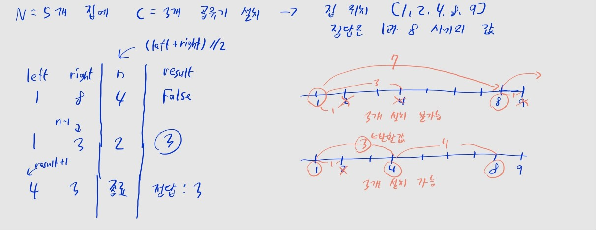 can_build가 False가 아닌 경우, 가장 인접한 두 공유기 사이 거리인 result를 반환.result로 두었을 때, 모든 공유기를 설치 가능하단 소립니다. (이때 n <= result 입니다)result보다 거리를 더 늘려도, 설치가 가능할 수도 있잖아요.answer에 현재 result를 저장하고, left = result + 1로 설정해 result보다 더 큰 위치의 값을 찾아봅니다.can_build가 False인 경우,right = n - 1로 설정해, n보다 더 좁은 범위의 값을 찾아봅니다.import sys