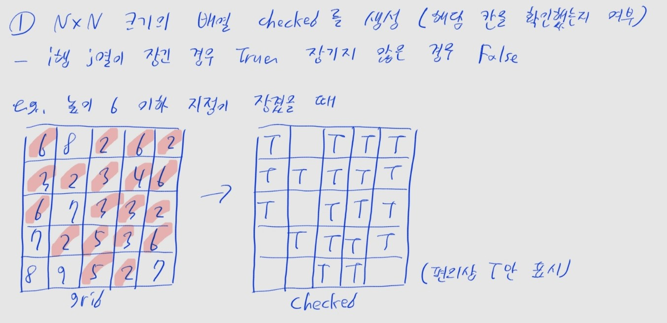 min_height), 최고 높이(max_height)를 계산합니다.min_height - 1만큼 내렸을 때부터 (최저 높이보다 적게 비가 왔으니, 아무곳도 잠기지 않음)max_height만큼 내렸을 때까지 (모든 곳이 잠김)물에 잠기지 않는 칸들이 서로 위, 아래, 오른쪽 혹은 왼쪽으로 인접해 있는 영역을 안전한 영역으로 정의합니다.height의 높이만큼 비가 왔다고 가정합시다.1. 크기의 2차원 배열 checked를 생성