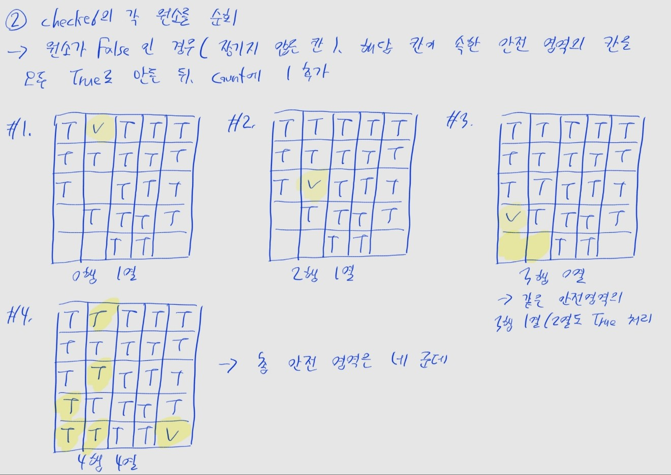 count를 0으로 초기화합니다.checked 배열의 각 원소를 2차원 반복문으로 순회합니다.False인 경우, 물에 잠기지 않은 칸이라는 뜻이겠죠?True로 바꿔 주고, count에 1을 추가합니다.