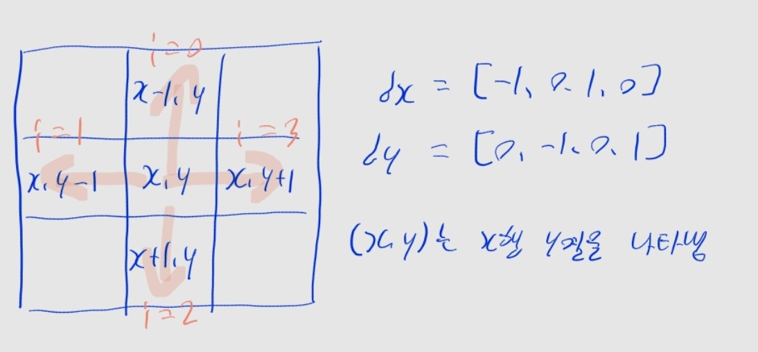 for문을 순회하면서 현재 위치 x, y에 dx[i], dy[i]를 더해 nx, ny를 계산합니다.i == 0이면 dx = -1, dy = 0로, (nx, ny)는 위에 있는 칸이 됩니다.i == 1이면 dx = 0, dy = -1로, (nx, ny)는 왼쪽에 있는 칸이 됩니다.i == 2면 dx = 1, dy = 0로, (nx, ny)는 아래에 있는 칸이 됩니다.i == 3이면 dx = 0, dy = 1로, (nx, ny)는 오른쪽에 있는 칸이 됩니다.최종 코드