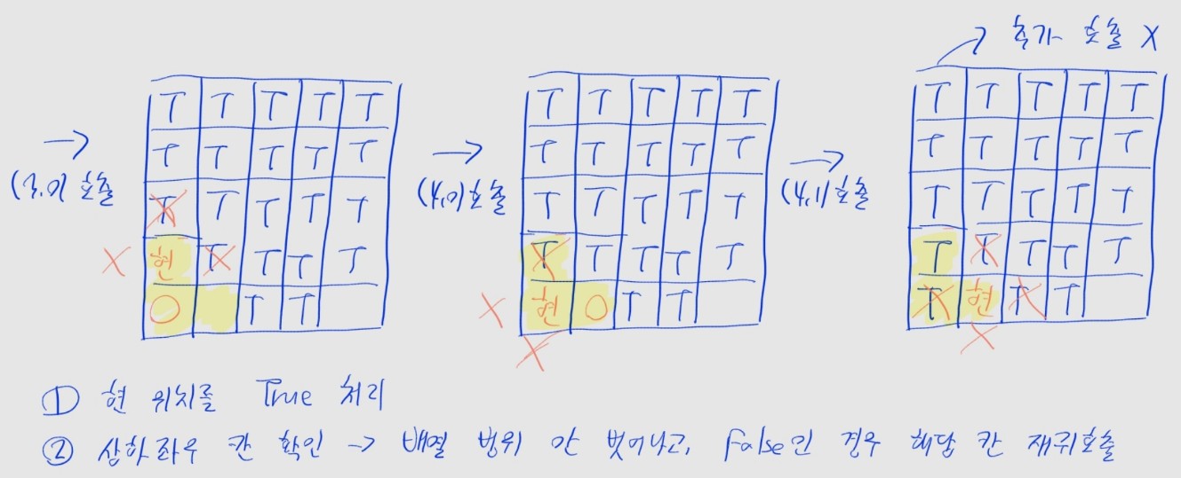check_spot(x좌표, y좌표, checked 배열)을 정의합니다. 이 함수의 동작을 설명하자면checked 배열의 현 위치 (x좌표, y좌표)를 True로 바꿔줍니다.checked 배열에서 False일 때check_spot()을 재귀 호출합니다.True로 바뀝니다.