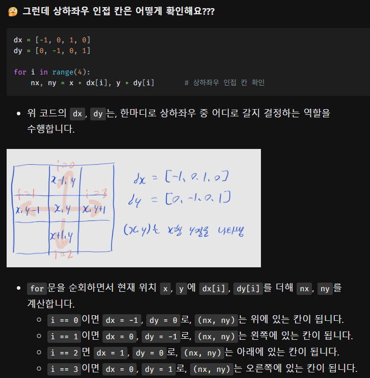 dx = [-1, 0, 1, 0], dy = [0, -1, 0, 1]의 각 원소를 순회하며x행 y열에 값을 더해주는 식으로 확인할 수 있습니다.grid[nx][ny] >= 1인지 체크하면 됩니다.0 이 저장된 칸이 있다면(현재 칸 x좌표, 현재 칸 y좌표)인 값에 1을 더해 줍니다.def get_answer():