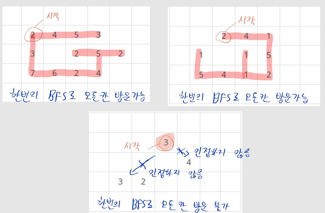 # BFS를 한 번 수행했는데 남은 칸이 있는 경우
