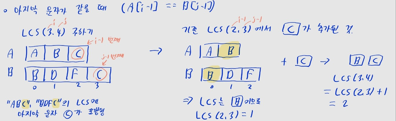 # 마지막 문자를 제외한 LCS의 길이에, 1을 더함